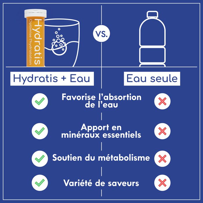 3 personnes sur 4 ne boivent pas assez d’eau au quotidien, entraînant fatigue et manque de concentration. Hydratis vous permet d’avoir une hydratation de meilleure qualitée pour une source d'énergie et de bien-être. Faites que chaque gorgée compte pour une vie plus saine et plus éclatante.