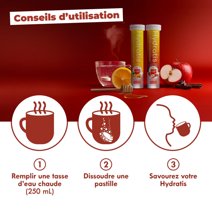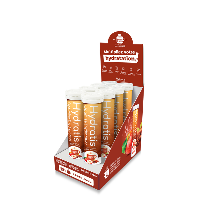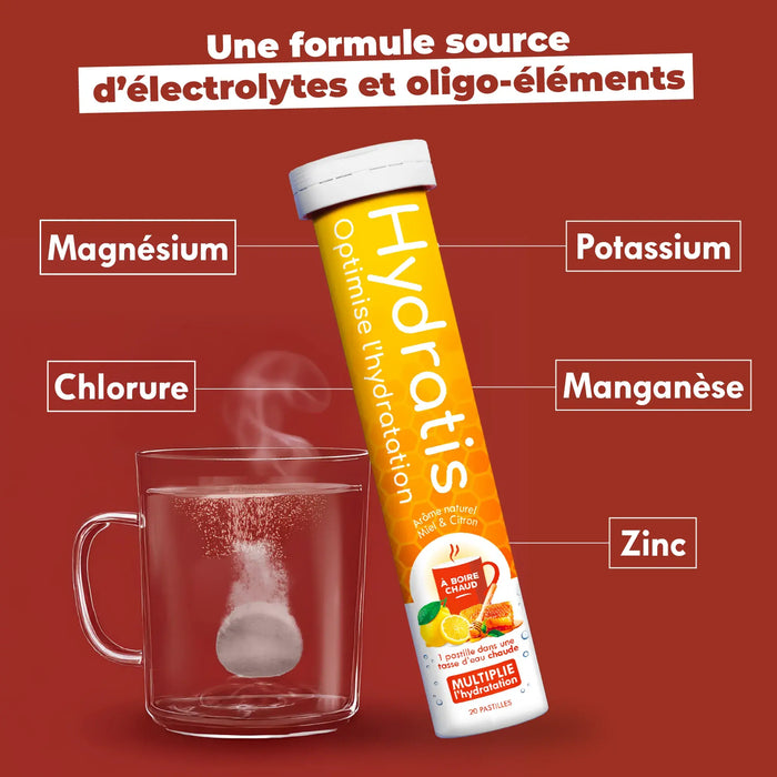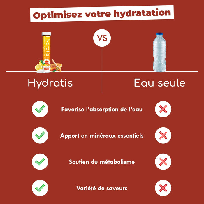 Hydratis permet d'augmenter la teneur en sels minéraux et en électrolytes. Utile pour les personnes qui font de l'exercice intense ou qui passent beaucoup de temps dans des conditions chaudes et sèches, pour aider à prévenir la déshydratation et les crampes musculaires.